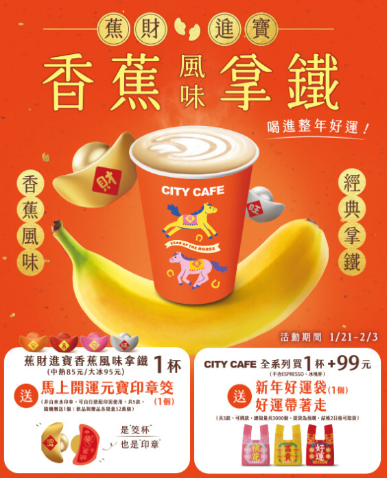 7-ELEVEN CITY CAFE昨(21日)起推出新品「蕉財進寶香蕉風味拿鐵」加贈好運印章筊。翻攝自CITY CAFE 官網