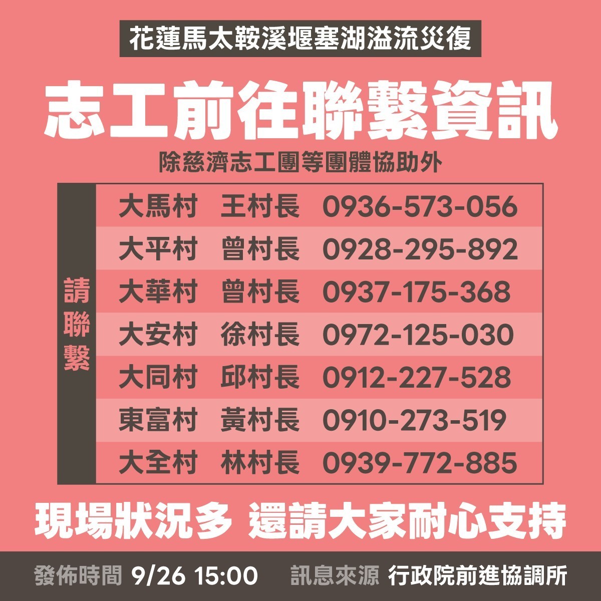 馬太鞍溪堰塞湖溢流成災,迄今釀成18死6人失蹤,行政院設立中央災害應變中心前進協調所指揮層級今(1日)起提高,總協調官改由行政院政務委員季連成輪任,清淤工作白天由環境部、縣府環保局共同協力,晚上由軍方接手,「24小時連續不斷」;此外,即起改以「以村為主」的責任區,災區7個村將派指揮官,未來由指揮官來分配志工、機具,力拚在中秋節前完成住家及道路清理,包含暖心的「鏟子超人」。