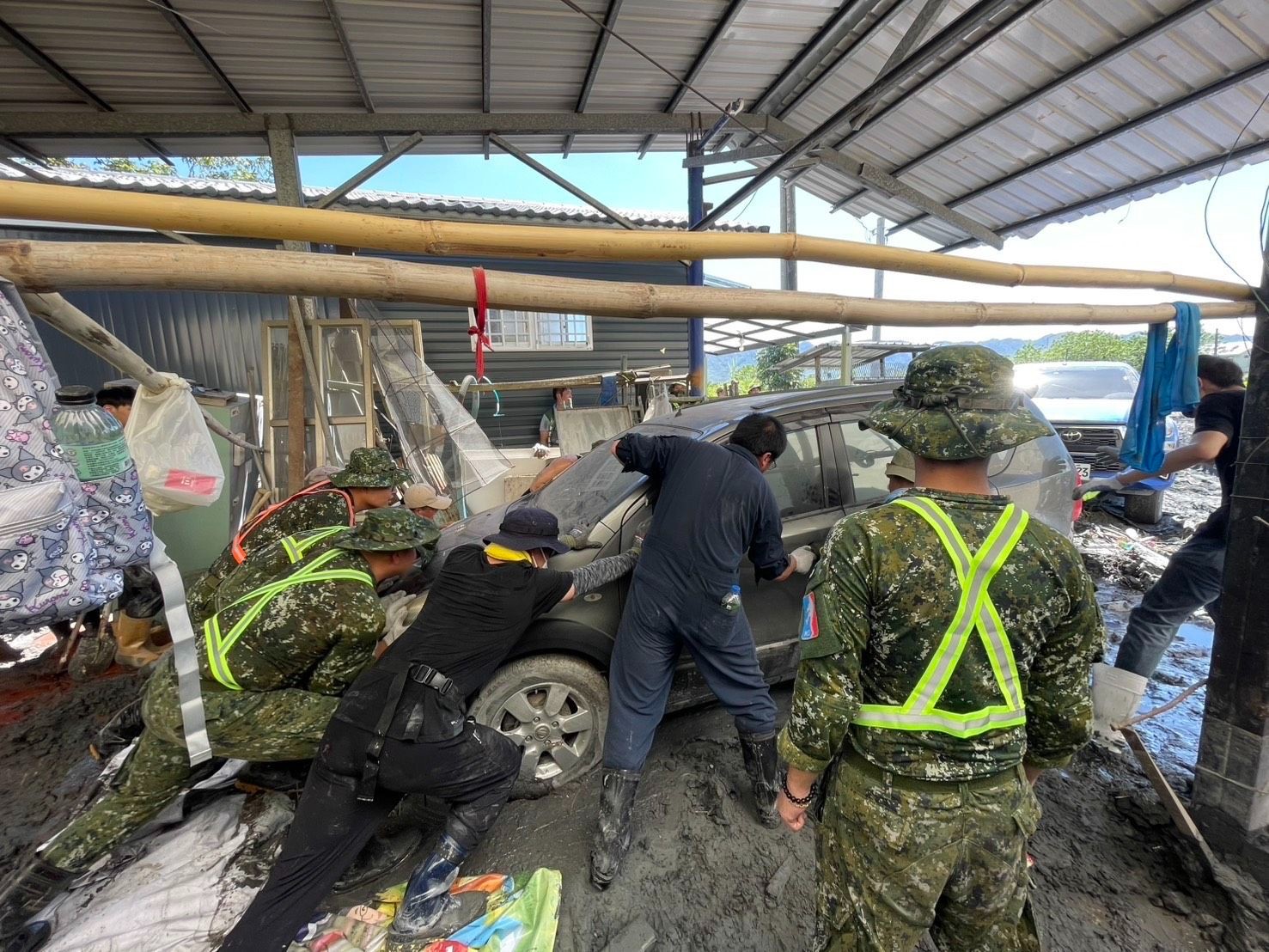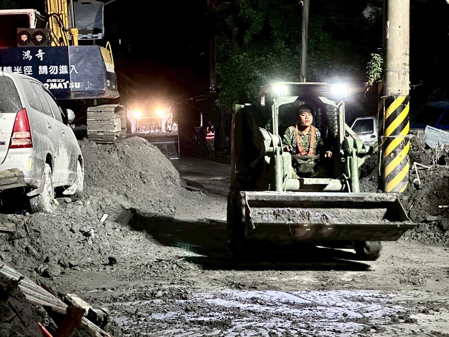 第5作戰區於今(1日)持續投入救災行動,增派500員官兵,肩負「戰時能作戰、平時能救災」使命,今為增派兵力投入的首日,烈陽炙烤大地,弟兄姊妹除揮汗鏟除淤泥、清理廢棄物,更用心傾聽災民需求。此外,第5作戰區五二工兵群亦連夜運用重型機具,爭分奪秒投入搶修,並與民間企業共同運用機具協力作業,在黑夜中點亮希望之光。
