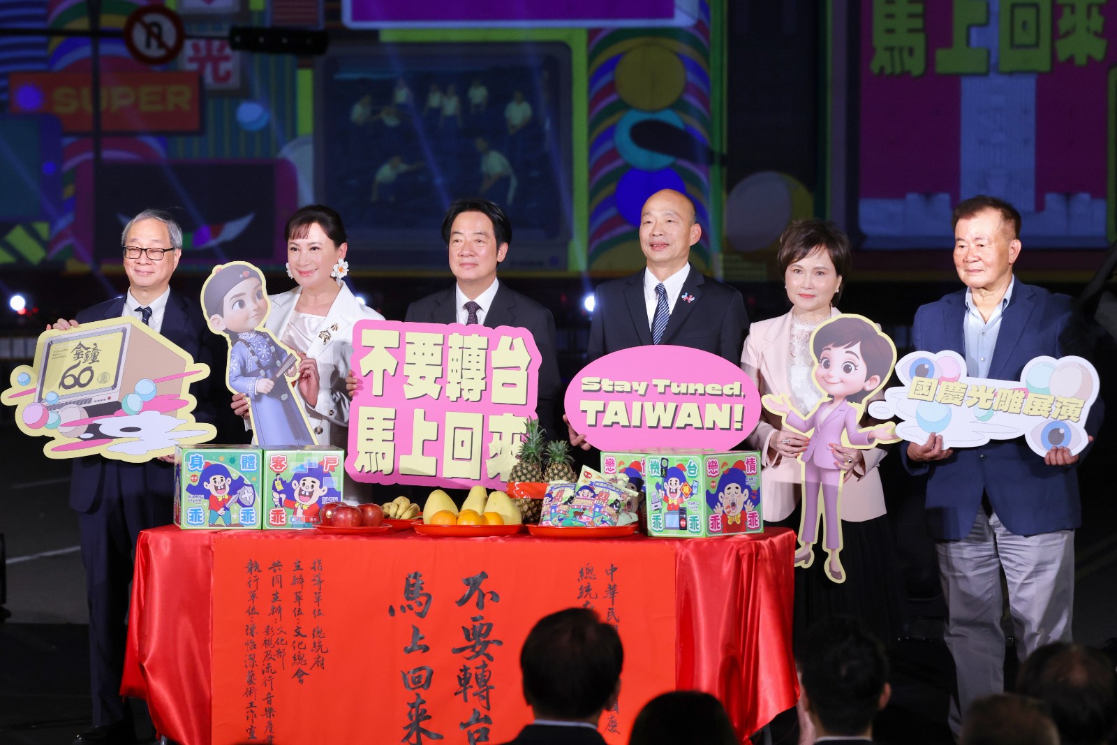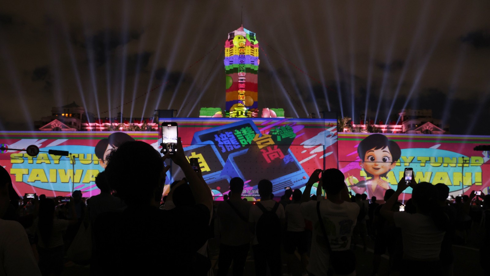 隨後,賴清德與韓國瑜、文化部長李遠、中華文化總會副會長江春男等共同為國慶光雕展演點燈,並與現場民眾一同欣賞精彩的光雕展演。