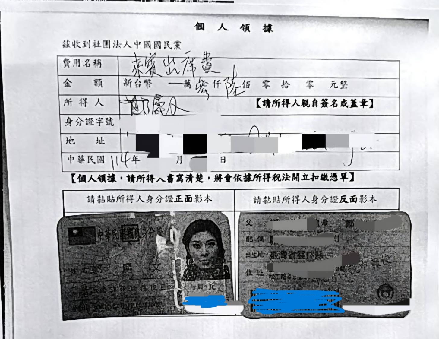 知情人士所提供的「個人領據」,是反惡罷後期,北台灣一場有挺藍人士收費與地方黨務系統合辦的造勢活動,鄭麗文簽收費用名稱為「來賓出席費」,金額為3600元,領據上「所得人」位置也有鄭親筆簽名。