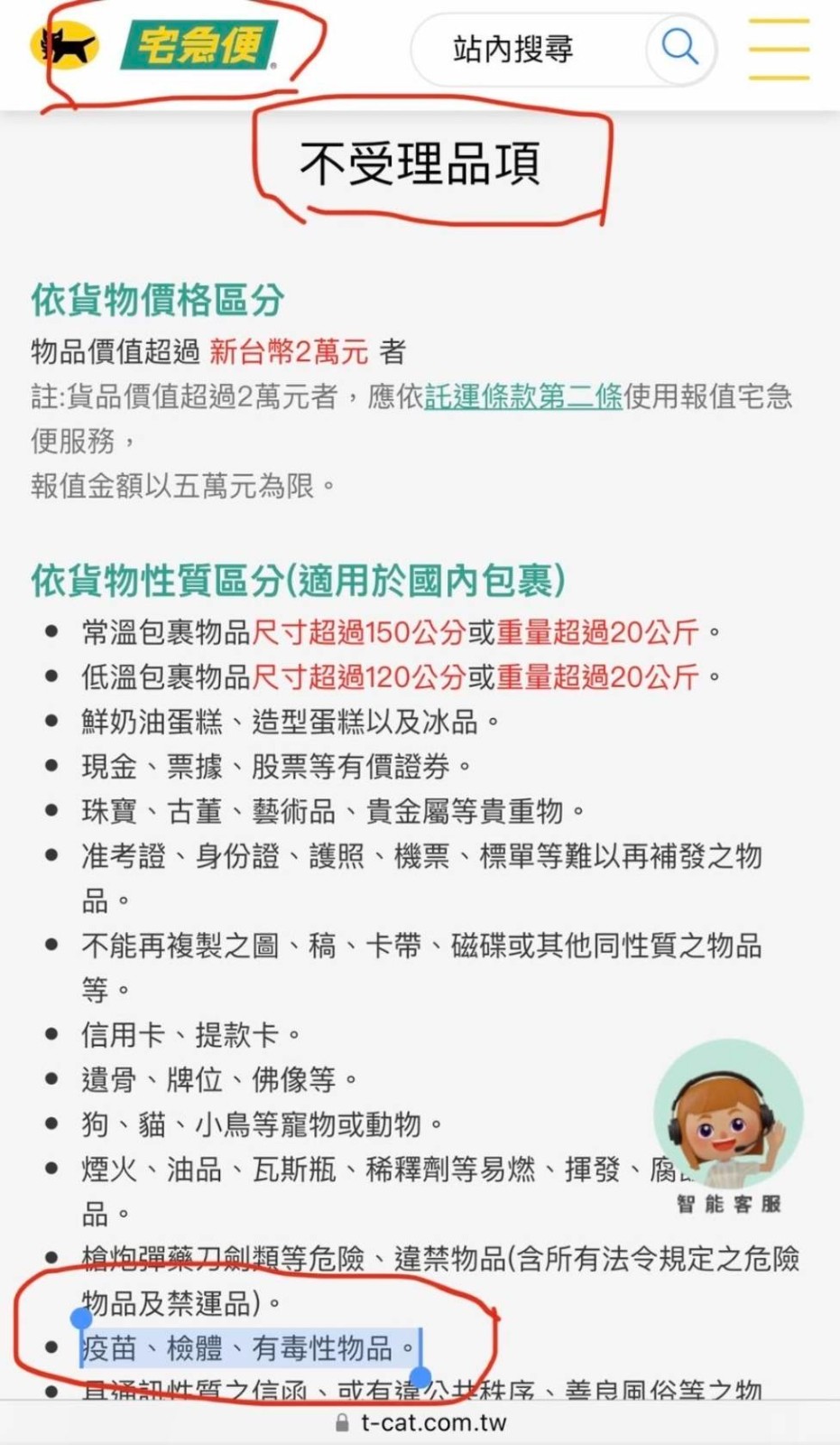 黑貓宅急便網站明文指出,疫苗、檢體不在包裹運送受理之列。翻攝自黑貓宅急便官網