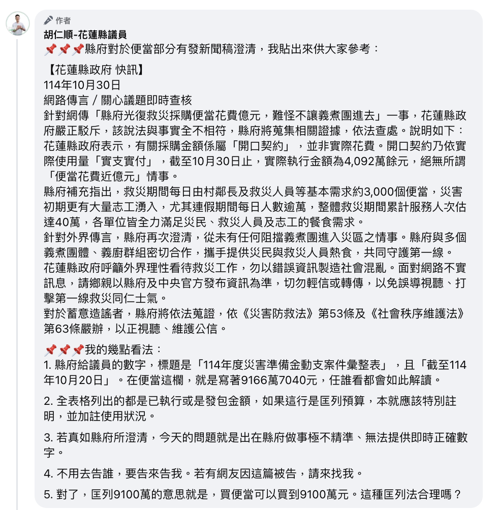 對於縣府的說法,胡仁順也在臉書留言處貼出回應,首先,縣府給議員的數字,標題是「114年度災害準備金動支案件彙整表」,且「截至114年10月20日」,在便當這欄,就是寫著9166萬7040元,任誰看都會如此解讀。他並談到,全表格列出的都是已執行或是發包金額,如果這行是匡列預算,本就應該特別註明,並加註使用狀況。