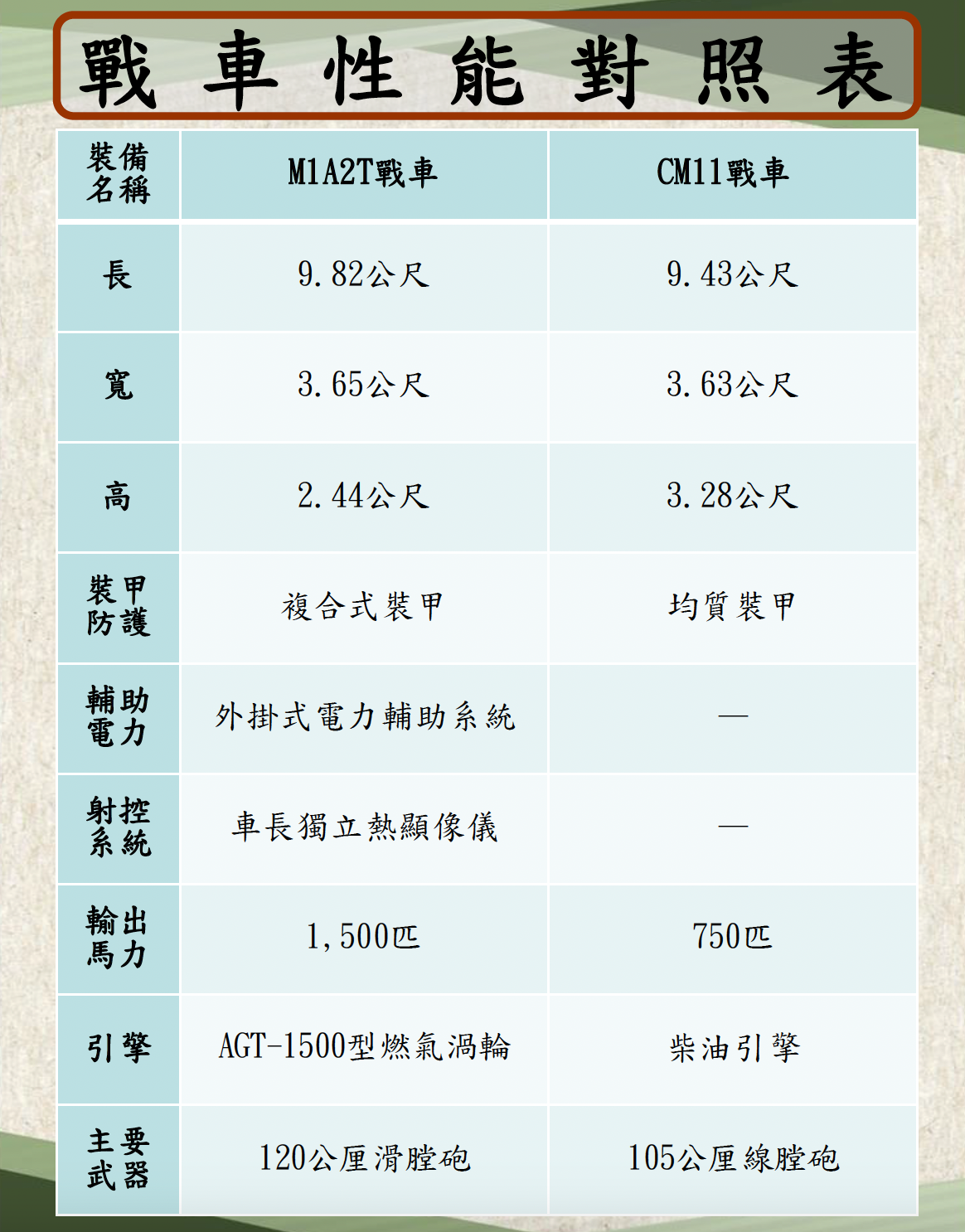 國軍主力戰車M1A2T戰車與CM11戰車性能對照表。陸軍司令部提供