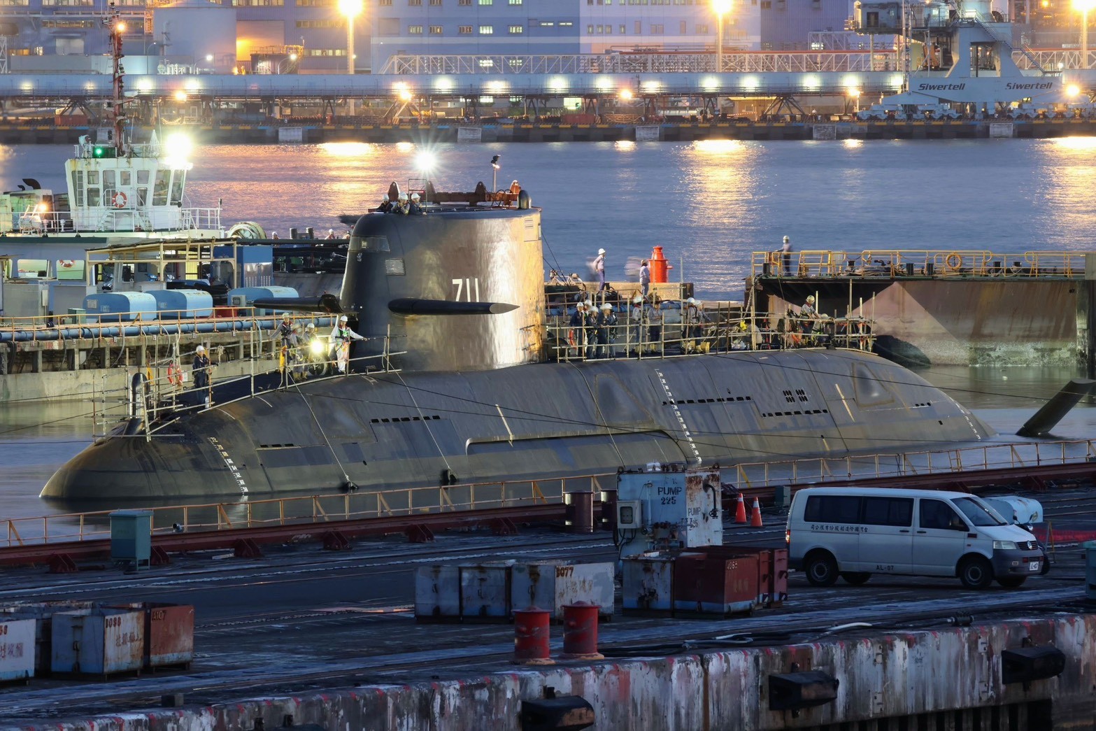國造潛艦首艘原型艦海鯤號資料照。2025.9.02晚間在台船乾塢進行潛航測試前的整備測試工作。照片:諸葛風雲提供