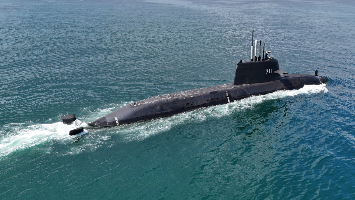 國造潛艦首艘原型艦海鯤號資料照。海鯤號於2025.7.3第三次海上測試,執行各系統海上動態組合驗證及潛望鏡功能測試。台船提供