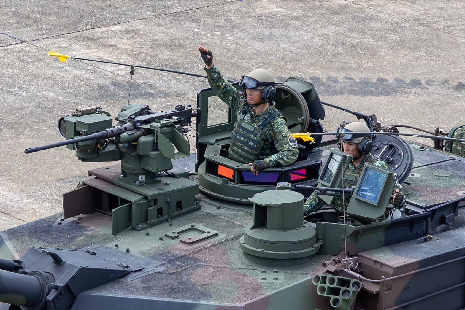 台灣首支接裝M1A2T戰車的陸軍584旅聯兵三營戰車連連長孫韜奇上尉(上),完成作戰任務交接後下達「攻擊前進」命令。左臂上有文總、青文創攜手漢光系列設計團隊設計的成軍紀念臂章。文總提供