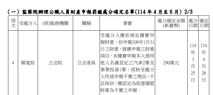 國民黨立法委員顏寬恒,於監察院今天(11/4)公布第290期廉政專刊,在監察院辦理公職人員財產申報罰鍰處分案件確定名單(114年4月至6月)名單中,赫見顏寬恒立法委員任內因109年1月申報的財產,未據實申報3筆資料,開罰290萬元。