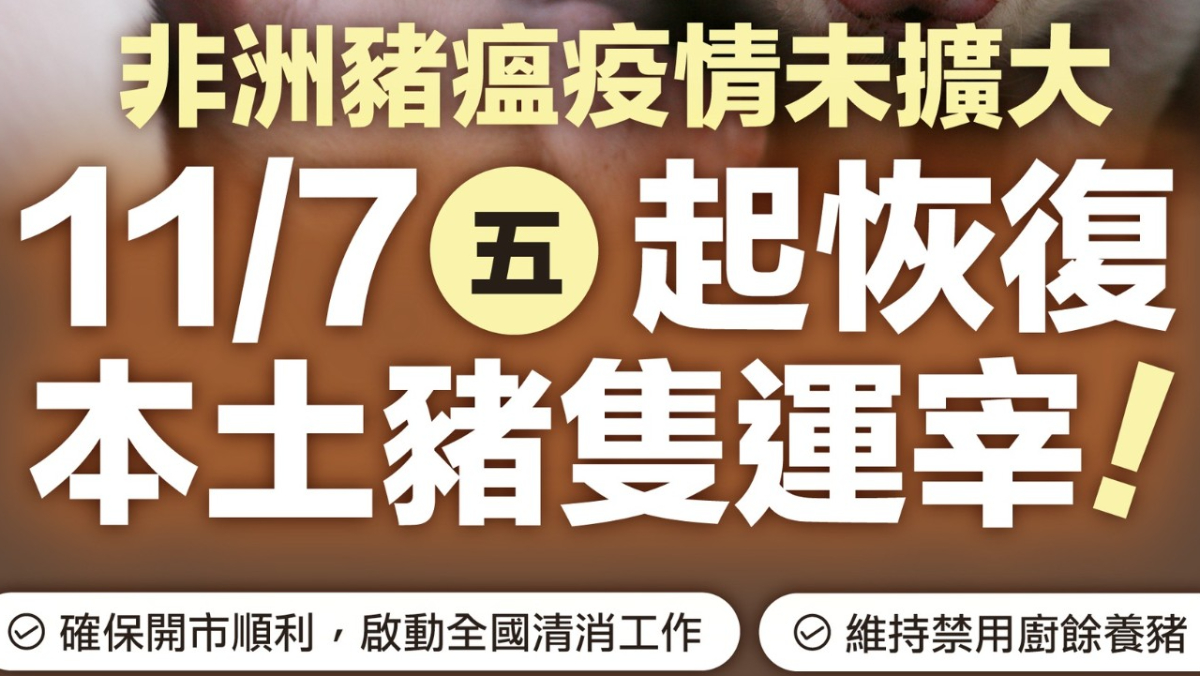 賴清德昨宣布11/6中午起恢復活體豬隻運送,自11月7日0時起,恢復拍賣、屠宰、屠體運輸。翻攝自臉書