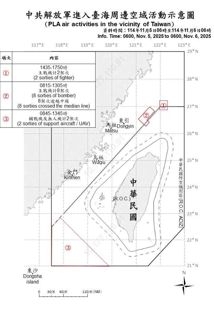 國防部2025.11.06公布中共解放軍臺海周邊海、空域動態,自11.5上午6時至11.6上午6時止,偵獲共機12架次(逾越中線進入北部及西南空域12架次)及共艦10艘,持續在台海周邊活動。國防部