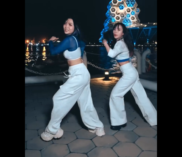 為迎接韓國超人氣女團TWICE,黃捷(右)特地找來舞蹈老師教學,在應援地標流行音樂中心前大跳TWICE〈THIS IS FOR〉。翻攝自黃捷Threads
