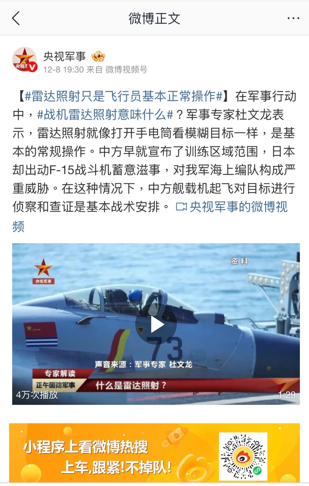 中國官媒央視軍事微博帳號2025.12.8發布所謂「雷達照射只是飛行員基本正常操作」,指共機殲-15以雷達照射日方F-15「屬於正常」。截自微博「央視軍事」