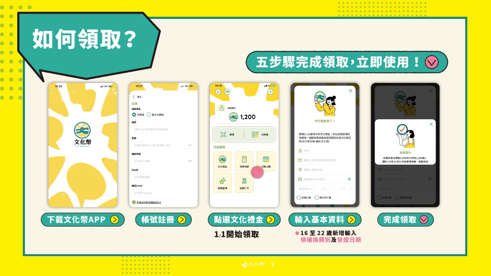 針對13-22歲青少年,每人發放1200點文化幣,1點等於新臺幣1元,可用於看表演、看展覽、看國片、買書、文創工藝DIY等藝文消費折抵,領取使用期間自115年1月1日至12月31日止。特別提醒,元旦上午8點起正式開領。