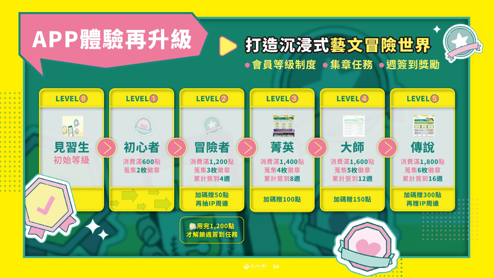 LV.3菁英,累積消費1,400點、蒐集4枚徽章並累計簽到8週,即可獲得文化幣加碼100點;