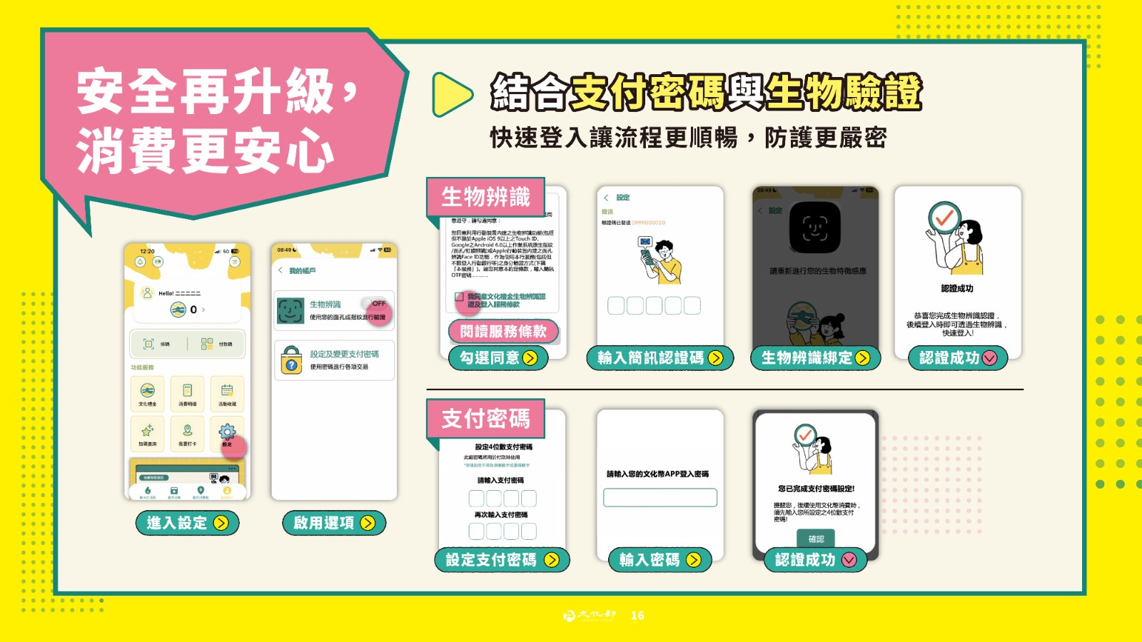 文化幣APP導入支付密碼與生物驗證,快速登入讓文化幣使用更順暢,防護更嚴密。