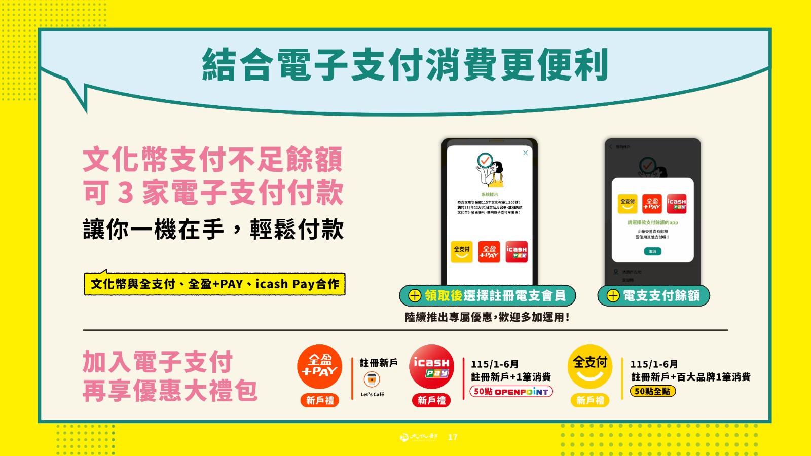 文化幣與全支付、全盈+PAY、icash PAY合作,消費使用文化幣不足餘額,除了以現金方式支付外,可以直接在APP點選電子支付圖示,開啟電子支付進行付款。電子支付並陸續推出文化幣專屬優惠,歡迎青少年朋友多加運用。