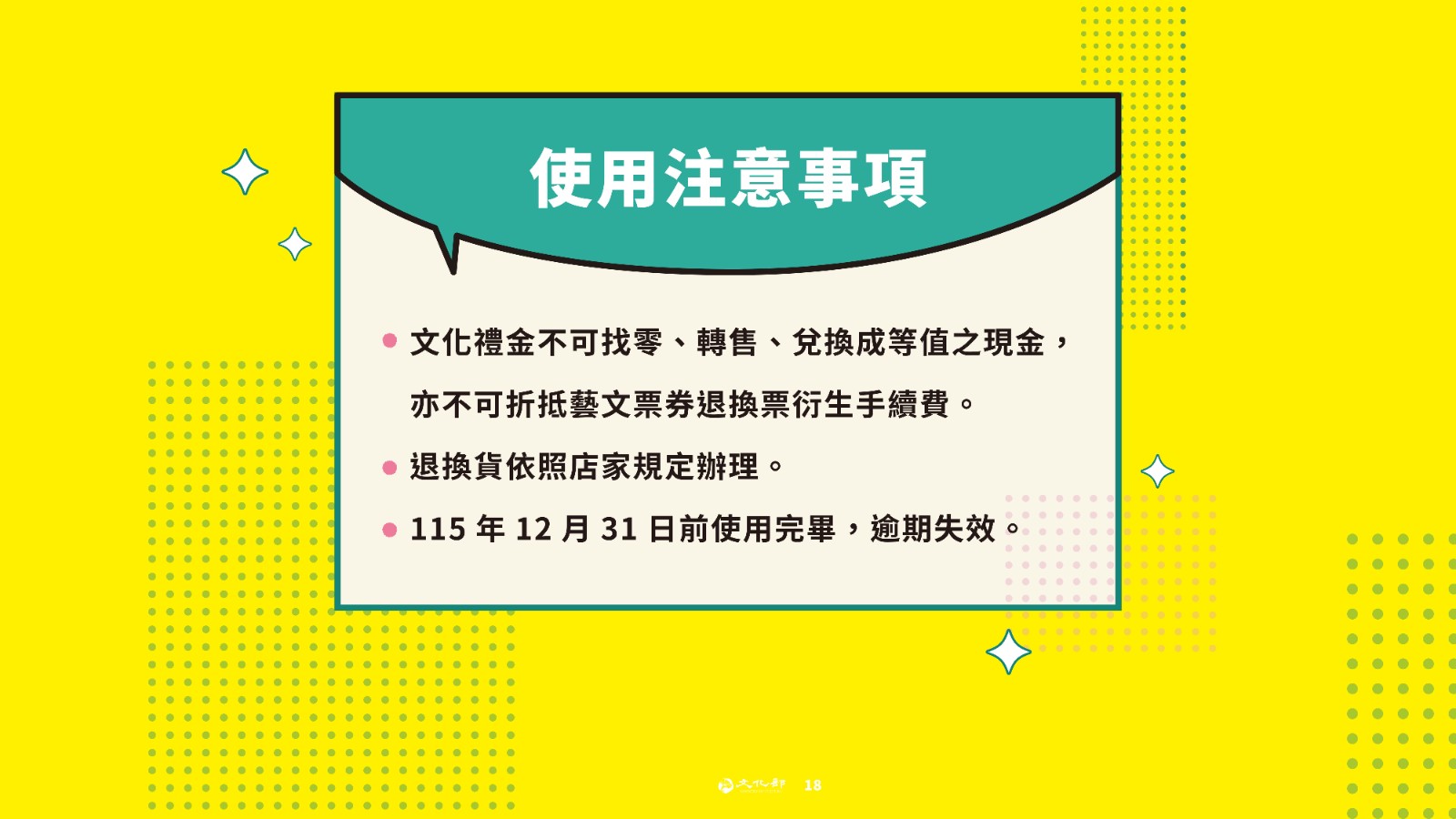 看完六式攻略後,文化部也特別提醒所有年輕朋友,留意文化幣相關使用規範,開心使用、好好運用,讓每一次文化體驗都更有感。