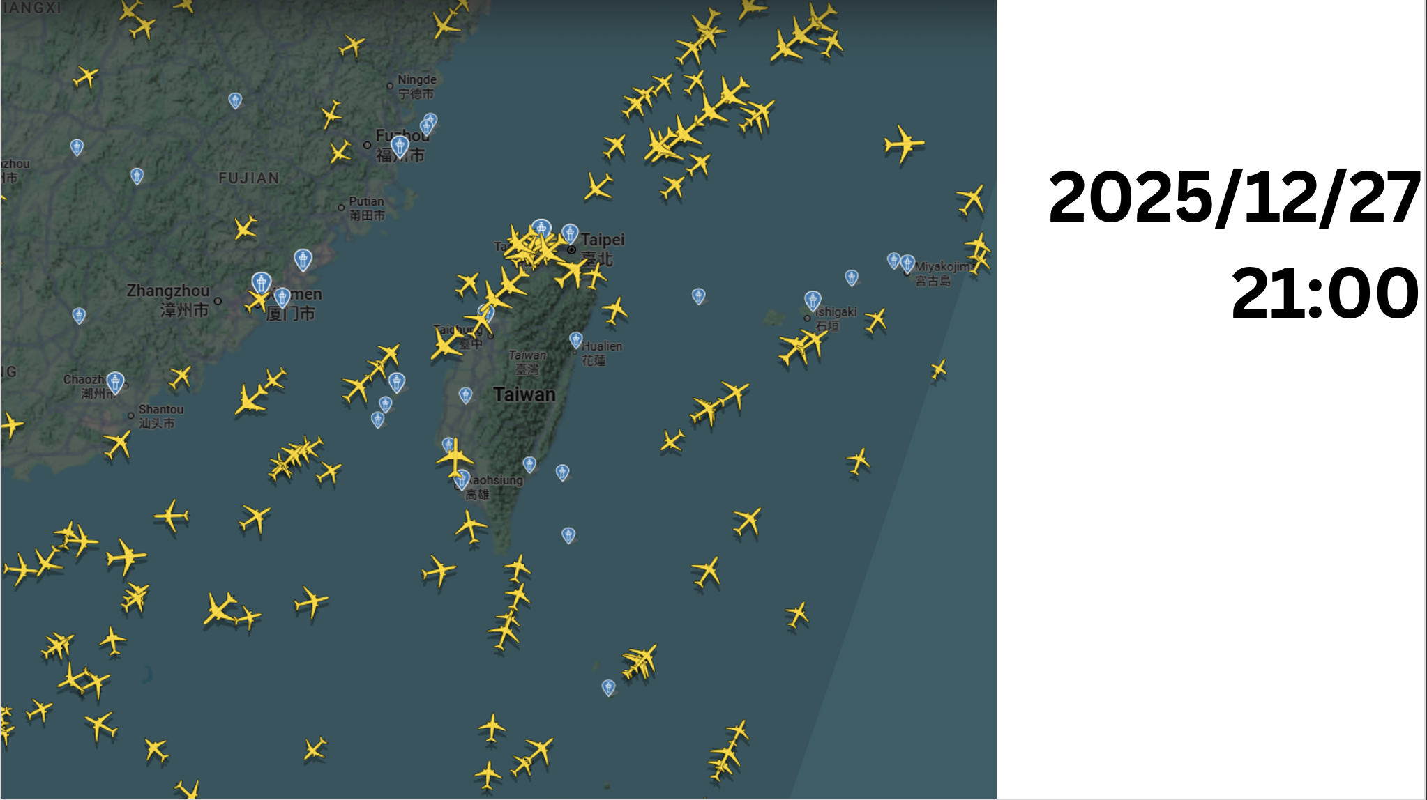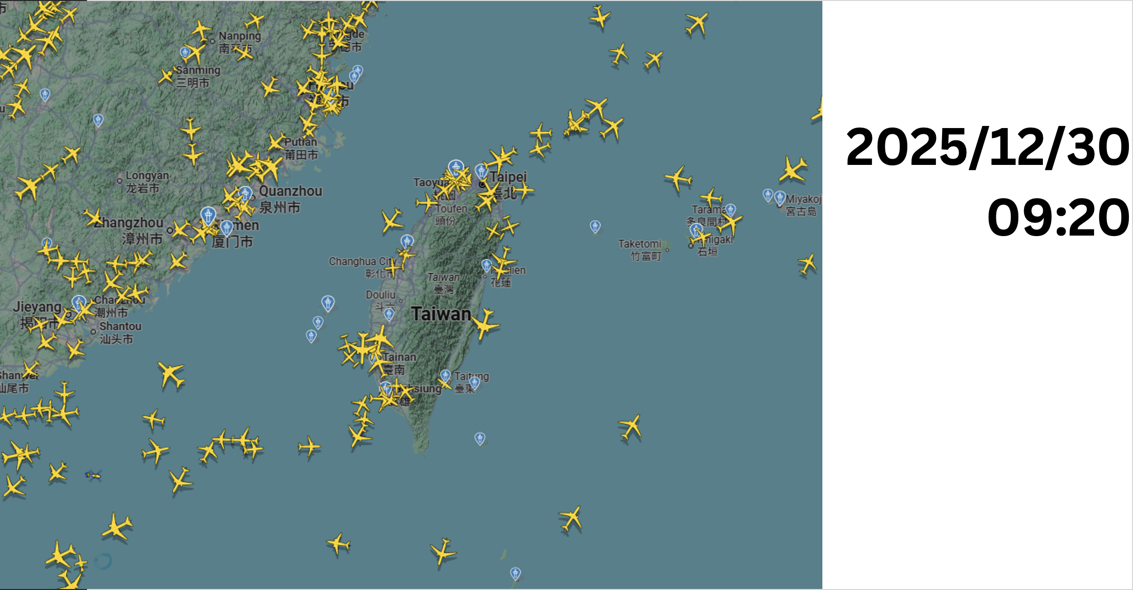 中國軍演第二天2025.12.30上午,對台灣周邊飛航造成影響,為了安全起見,台灣民航單位規劃國際航線替代航線飛行,避開中國在台海中線劃設的演訓區,部分航班受影響,但整體航空流量都正常。截自Flightradar24