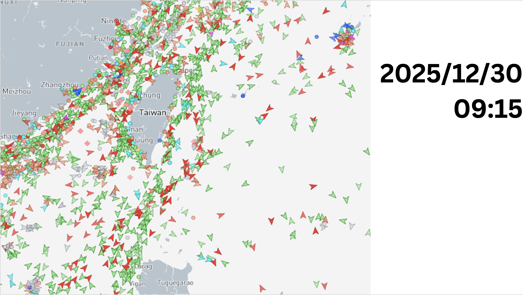 中國對台軍演「正義使命-2025」第2天,船舶定位系統顯示,2025.12.30上午,台海周邊國際水域航行船隻如常通行、船隻也正常進出台灣各港口,並未如中國官媒宣稱「封鎖」四大港口。圖片截自網路