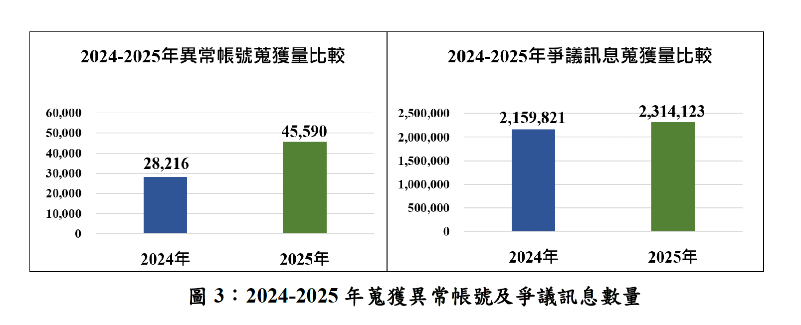 國安局表示,2025年,國安情報團隊查報逾4.5萬組異常帳號、蒐獲逾231.4萬則爭訊;全年通報政府相關部門計3,200餘則爭訊,俾利政府即時應處中共對我認知戰操作。