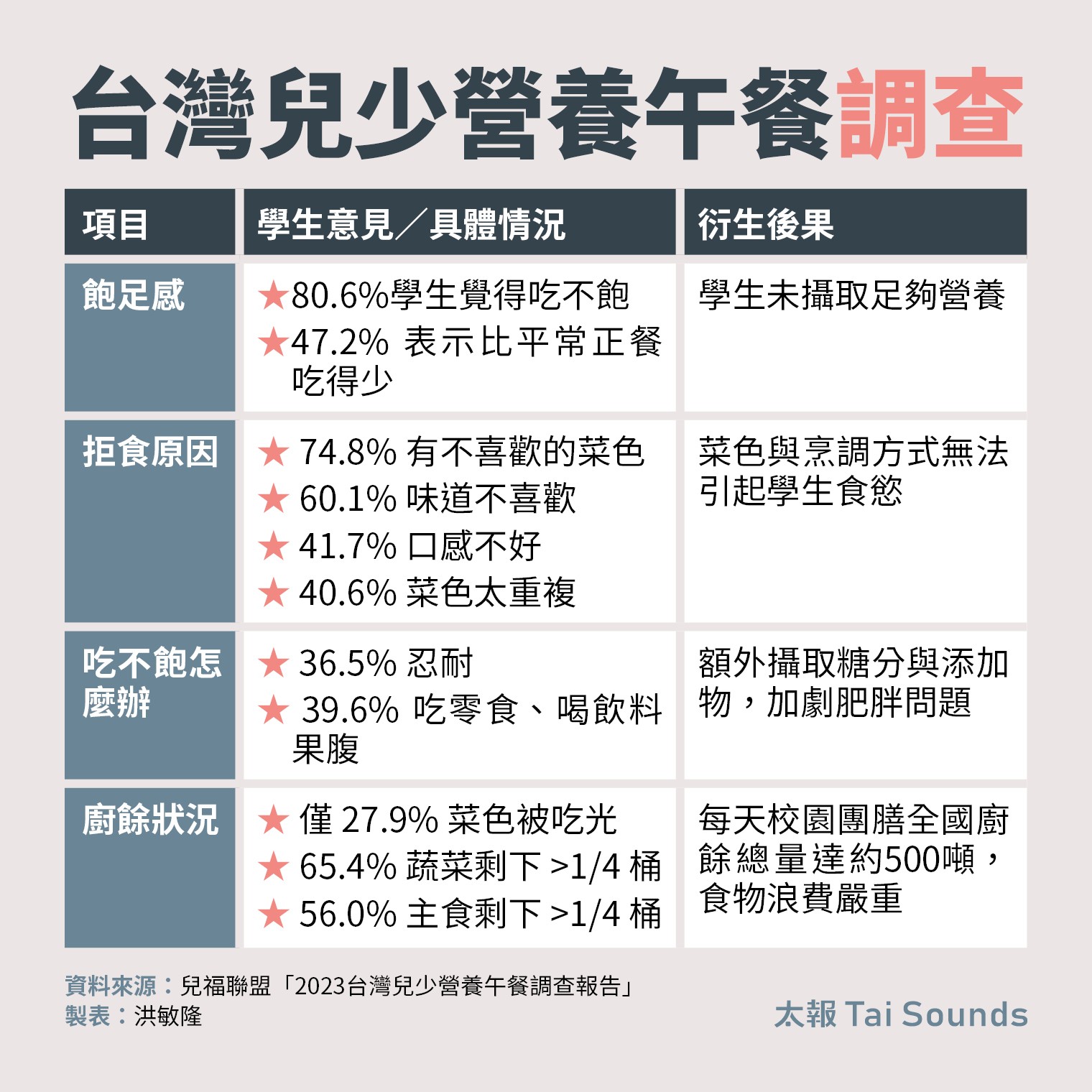 兒福聯盟的「2023台灣兒少營養午餐調查報告」給出殘酷答案。調查顯示,高達80.6% 的國中生表示有「吃不飽」的經驗。奇怪的是,吃不飽並非因為供應量不足,而是因為「不想吃」。數據指出,整體而言只有不到3成的菜色被全部吃光,剩下最多的是蔬菜,高達65.4%的班級剩下四分之一至半桶以上;主食類也有56%剩下大量廚餘。為什麼孩子寧願餓肚子,也不願吃午餐?學生們的心聲很直接:74.8%說有他不喜歡的菜色,60.1%說有他不喜歡的味道,41.7%認為口感不好。吃不飽有近4成孩子選擇吃零食、喝飲料果腹。