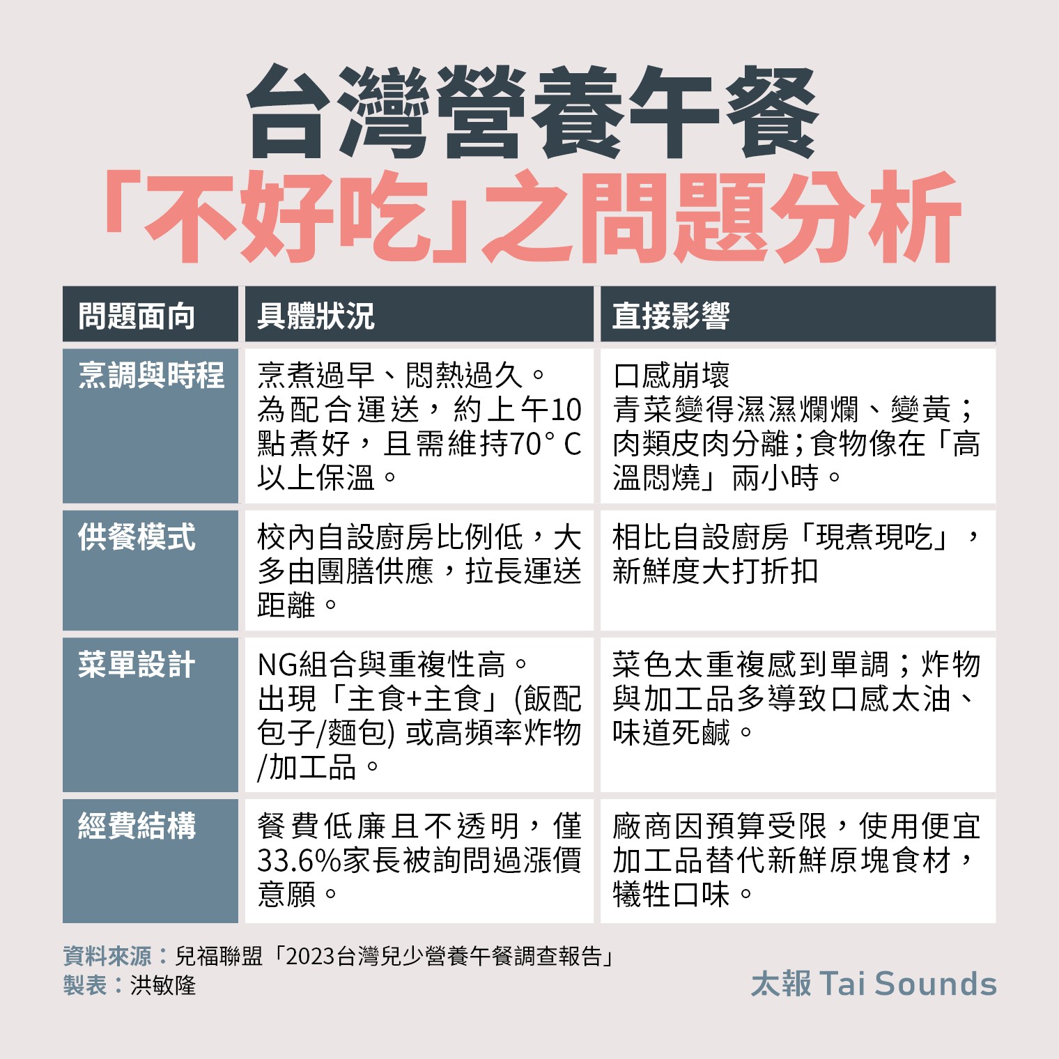 這意味著,當孩子中午12點開飯時,他們吃的是已經在高溫中「悶」了兩個小時以上的食物。這導致肉類皮肉分離、青菜濕濕爛爛變黃。這種物理上的口感崩壞,是再好的廚師也難以克服的距離障礙。兒盟調查也顯示,吃外訂桶餐的學生,給予午餐的評分顯著低於學校自設廚房的學生。