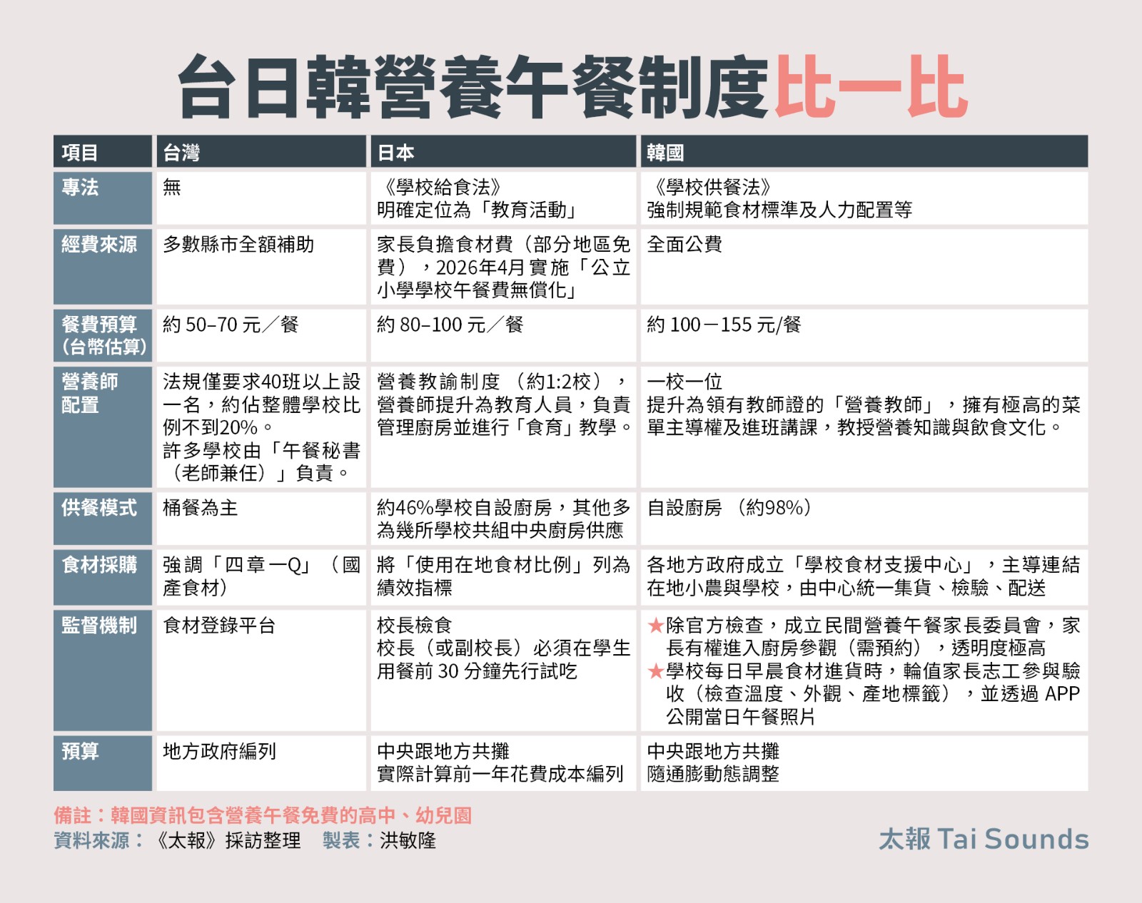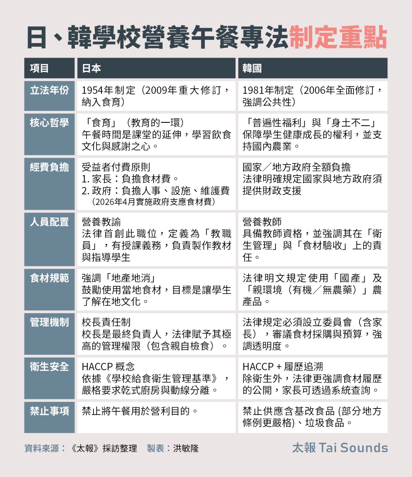 日本的立法核心是「食育」是教育的一環;韓國將營養午餐視為「普遍性福利」與「身土不二」;兩國專法都明定人員配置、食材規範、管理機制、衛生安全及以及政府的財政責任等事項。反觀台灣至今仍未有一部專門的學校午餐專法,僅有《學校衛生法》23條規定學校供應膳食者,應依據中央所定食物內容及營養基準,及優先採用在地優良農業產品,禁止使用含基因改造生鮮食材及其初級加工品。