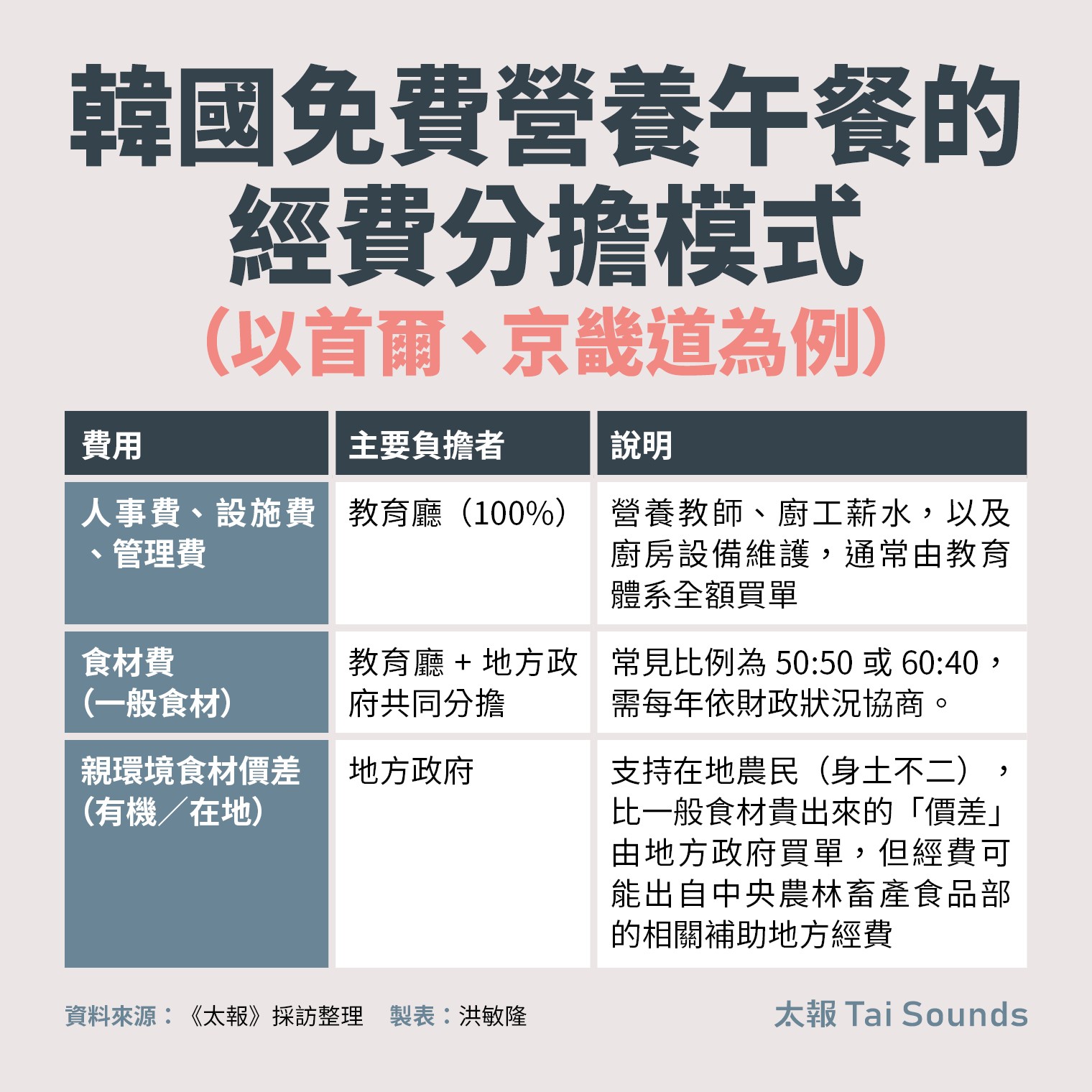 此外,韓國嚴格區分「食品費」與「營運費」。政府會額外保障食品費的比例,若廚工薪資上漲,政府會編列預算補足人事費,嚴格禁止挪用買菜錢去付薪水。