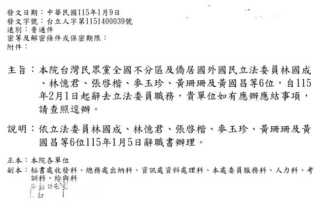 黃國昌等人5日已簽署辭職書,並交付立院。立法院9日發函給秘書處等單位,因6人2月1日起辭去立委職務,若有應辦應結事項,查照逕辦。
