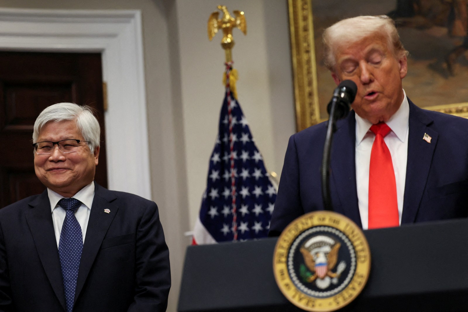 美國總統川普(右)去年年3月3日宣布台積電新增投資美國1千億美元,左為台積電董事長魏哲家。路透社