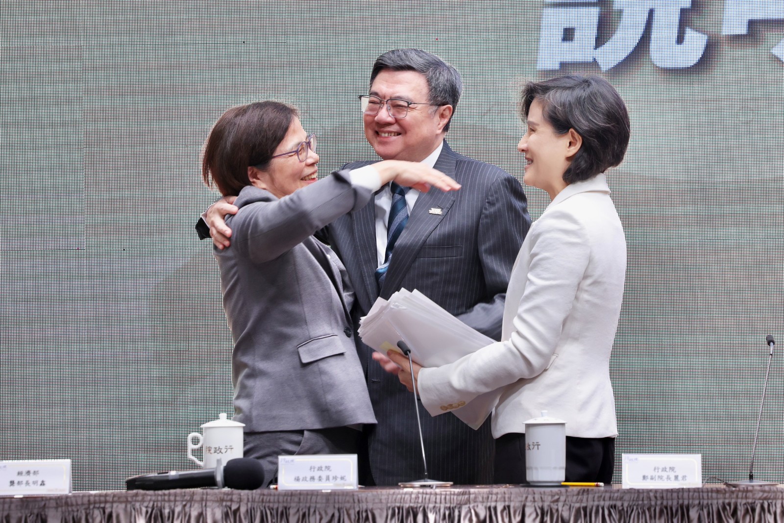 台美關稅談判成果好,說明記者會上,政委楊珍妮擁抱閣揆卓榮泰,鄭麗君在一旁也露出笑容。廖瑞祥攝