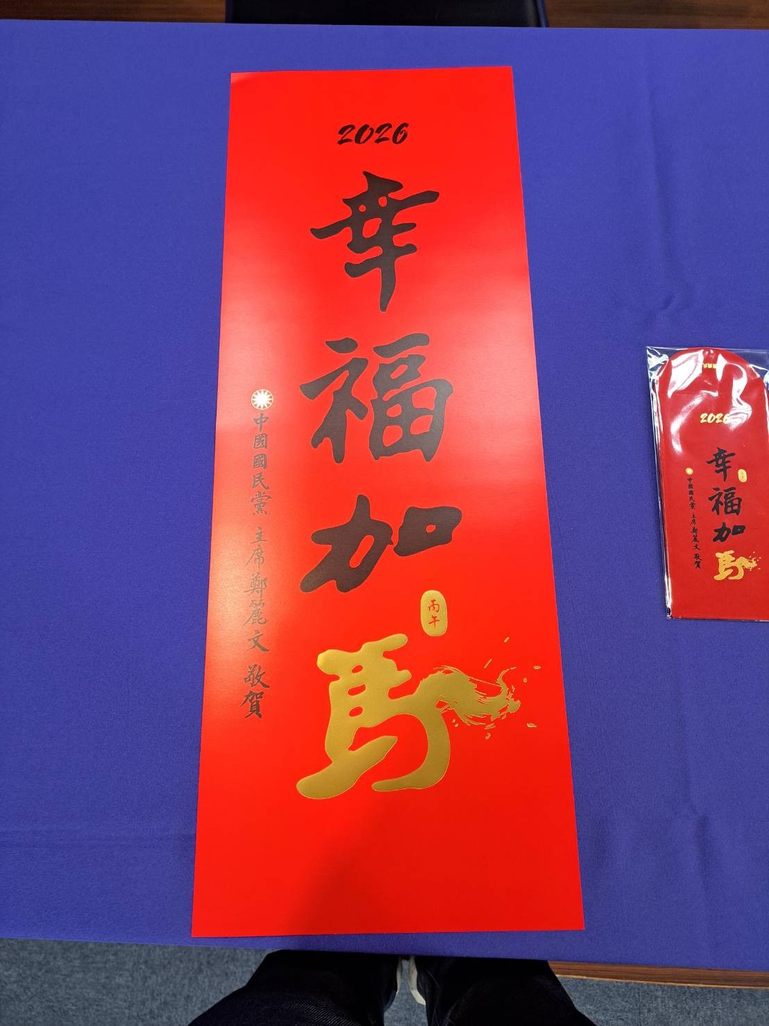 國民黨主席鄭麗文明公布「幸福加馬」馬年春聯、紅包袋、1元開運紅包。周志豪攝