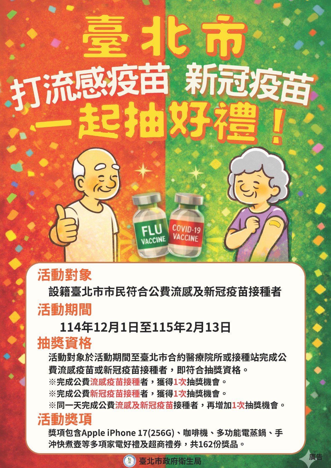 衛生局也提醒,自115年1月1日至2月28日止,已擴大新冠疫苗公費接種對象為「滿6個月以上尚未接種的民眾」,在抽好禮活動期間完成接種,同樣具備抽獎資格。相關疫苗接種資訊,可至臺北市政府衛生局官網查詢,或洽詢12區健康服務中心。
