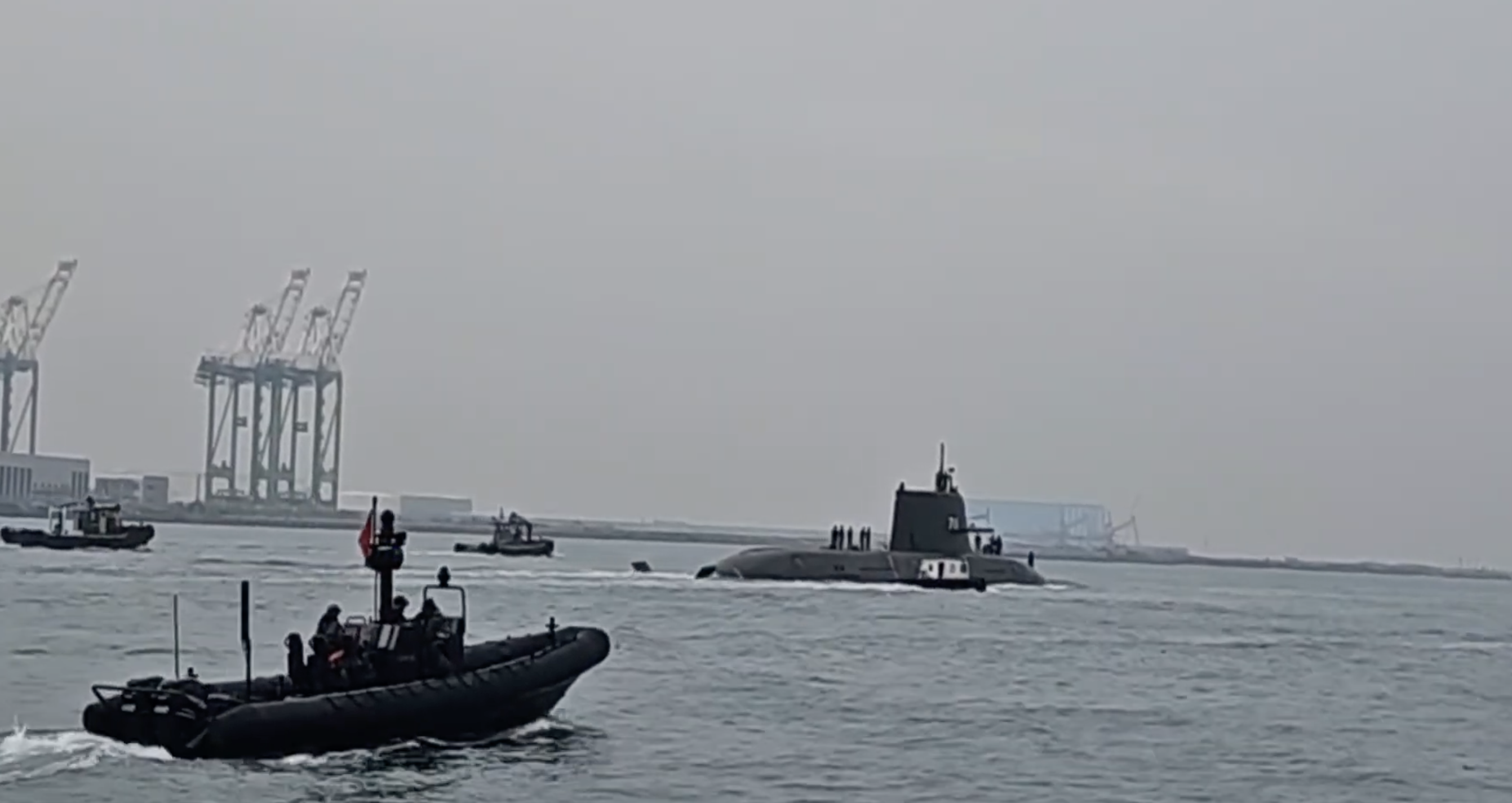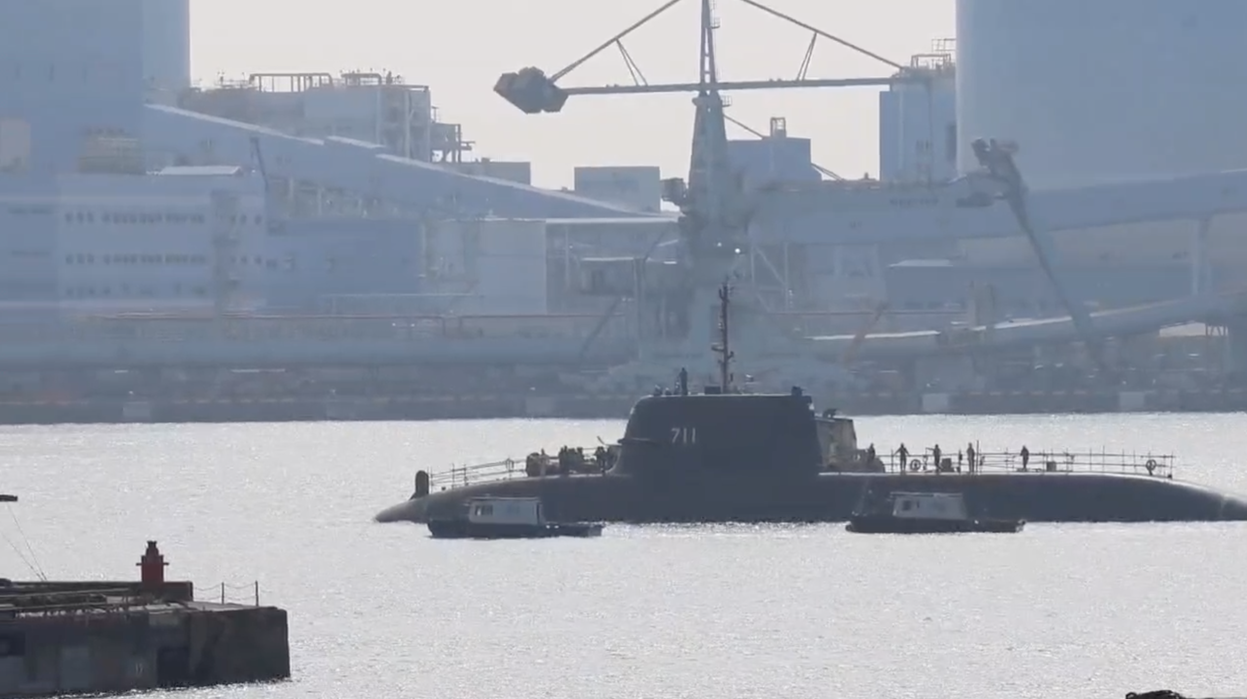 國造潛艦(IDS)計畫首艘原型艦海鯤潛艦(舷號711)第5度出海進行浮航測試,2025.11.28上午9時駛出高雄港。截自諸葛風雲直播YouTube