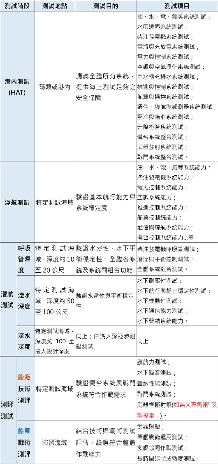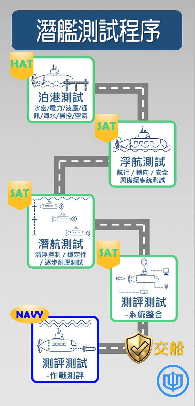 台船指出,為保安全,並考慮複雜性,潛艦的完工測試須採分階段、多科目、多航次的漸進式測試方式,逐步發現問題、改善缺失、調校性能。潛艦測試的主要階段包括泊港測試(HAT)、海上測試的浮航測試、海上測試的潛航測試、測評測試的系統整合階段,以及交船後由海軍進行的測試測評中的作戰測評階段等,如下圖: