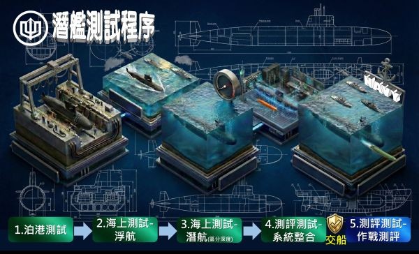 台船潛艦科普知識第二波主題,說明潛艦測試程序說明圖。台船提供