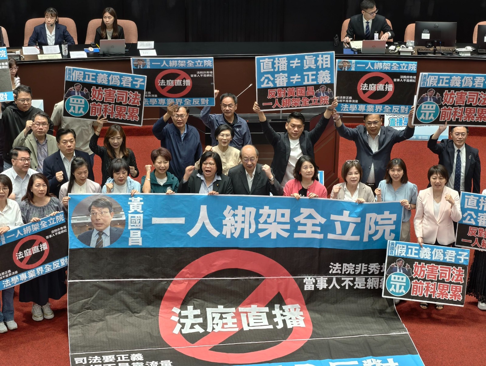 草案更提及,高院、地院審理重大公益或社會矚目案件,公開辯論及宣示時的錄音錄影,可依被告聲請或法院依職權裁定以適當方式公開播送。這也是「公開播送」4個字的首度問世。不過,民眾黨立委黃國昌、張啟楷、陳昭姿於同年6月間,突然又二度送出《法院組織法》修正案,內容大同小異,同樣明訂「公開播送」,草案版本僅微調條文字句,例如將「被告」改為「當事人」。立法院審查《法院組織法》修正草案,民進黨立院黨團表態反對。資料照。陳祖傑攝