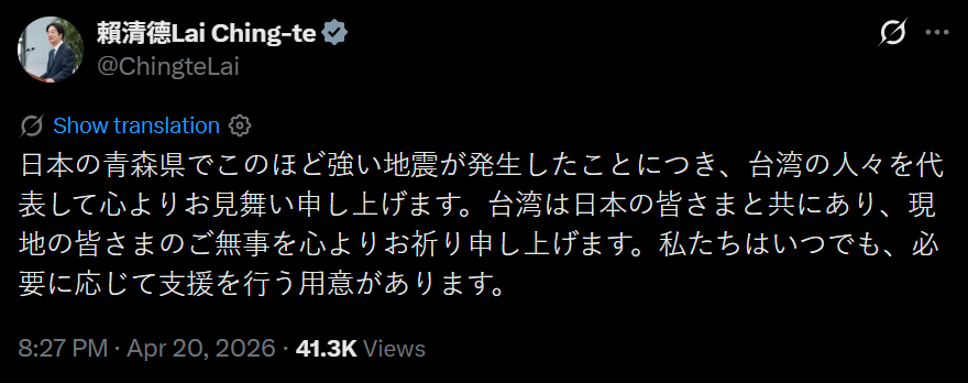 總統賴清德在社群平台X上貼文,表示「隨時提供日本必要協助」。取自賴清德X