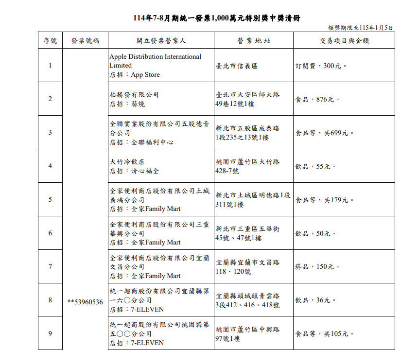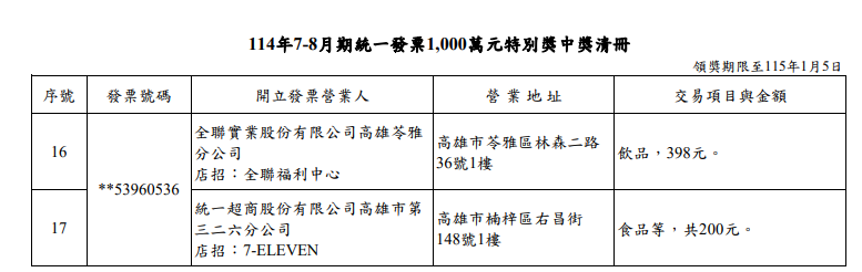 114年7-8月期統一發票1,000萬元特別獎中獎清冊。財政部提供