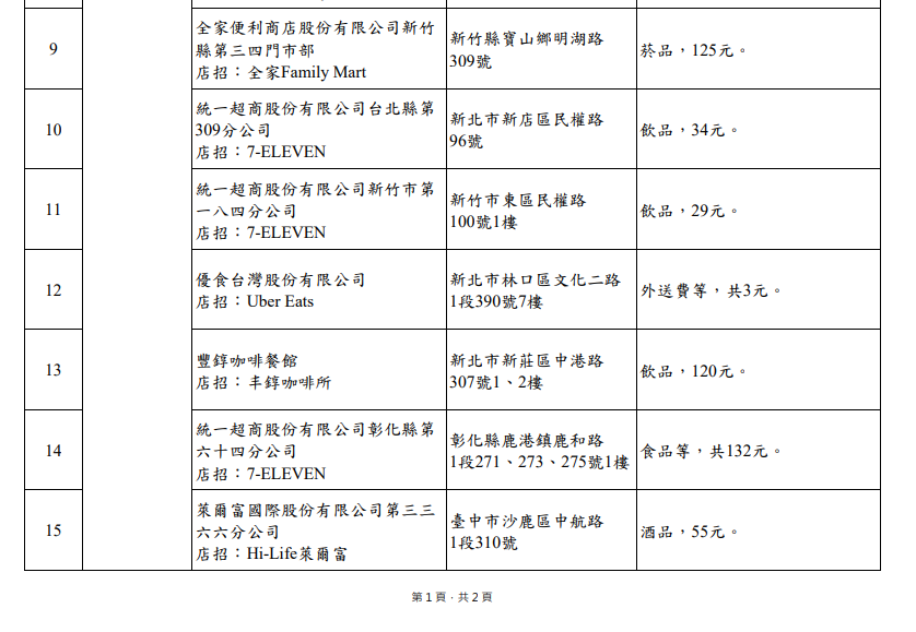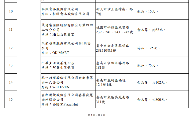 其他還有在桃園市蘆竹區的蘆工門市花105元購買統一麵包、飲品;台南市龍崎區的關北站門市花102元購買飯糰、飲品;高雄市楠梓區的鑫建昌門市花200元購買統一麵包、飯糰。