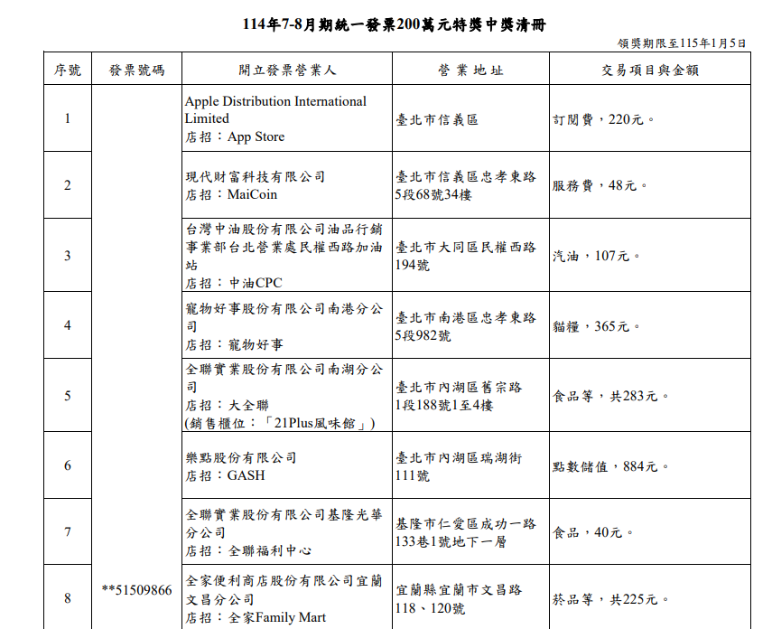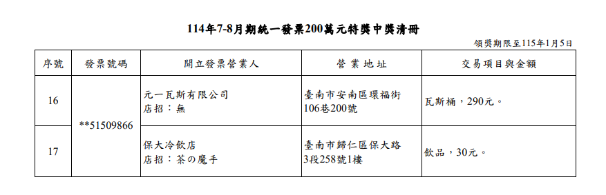 114年7-8月期統一發票200萬元特獎中獎清冊。財政部提供