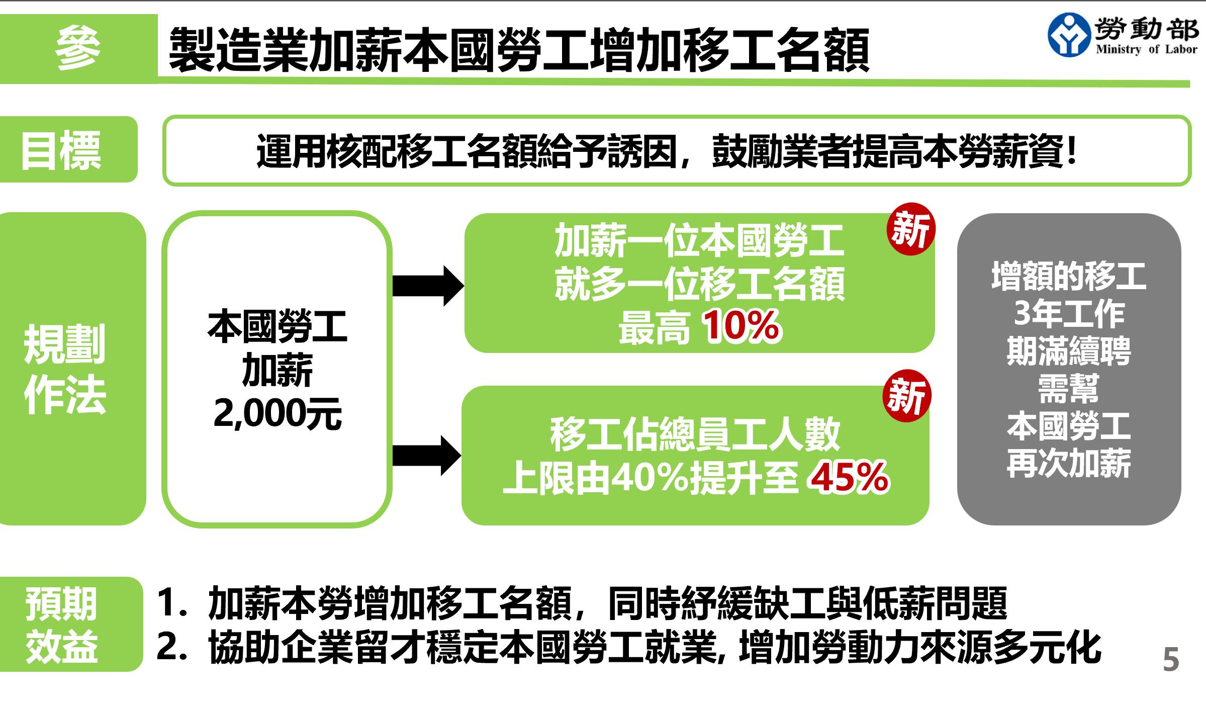規劃新增製造業移工附加名額核配機制,製造業雇主為其聘僱全時工作的本國籍勞工加薪2000元,每加薪一位本勞就在3K5級制核配名額外多一位移工名額,最高不得超過其勞保投保人數10%,且採取此方案的雇主,所聘僱移工名額最高上限,由原本的勞保投保人數40%提升至45%。
