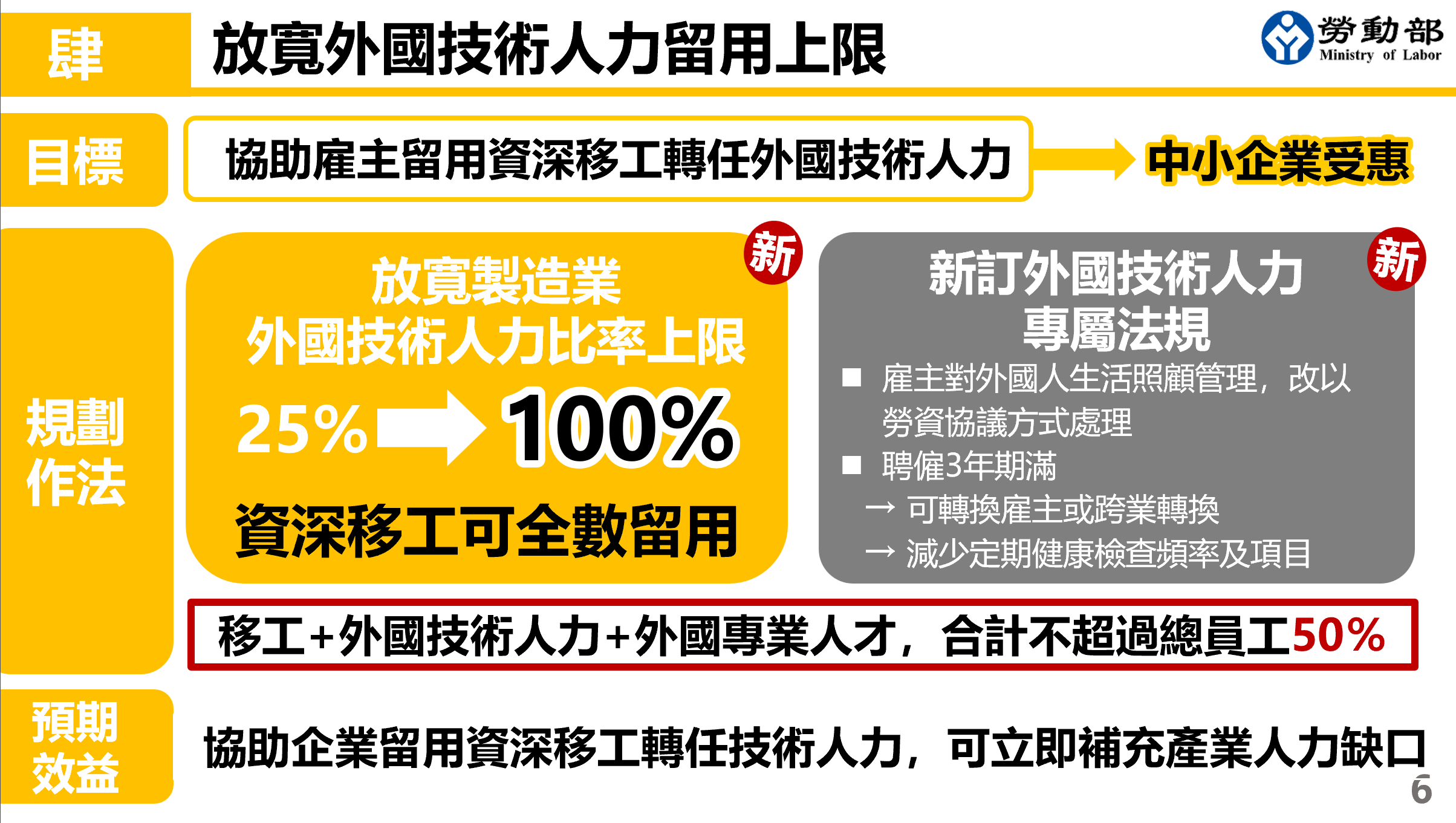 製造業技術人力核配上限由25%放寬至100%,以協助雇主留用資深移工轉任外國技術人力,但移工、外國技術人力及外國專業人才,合計不得超過總員工的50%。