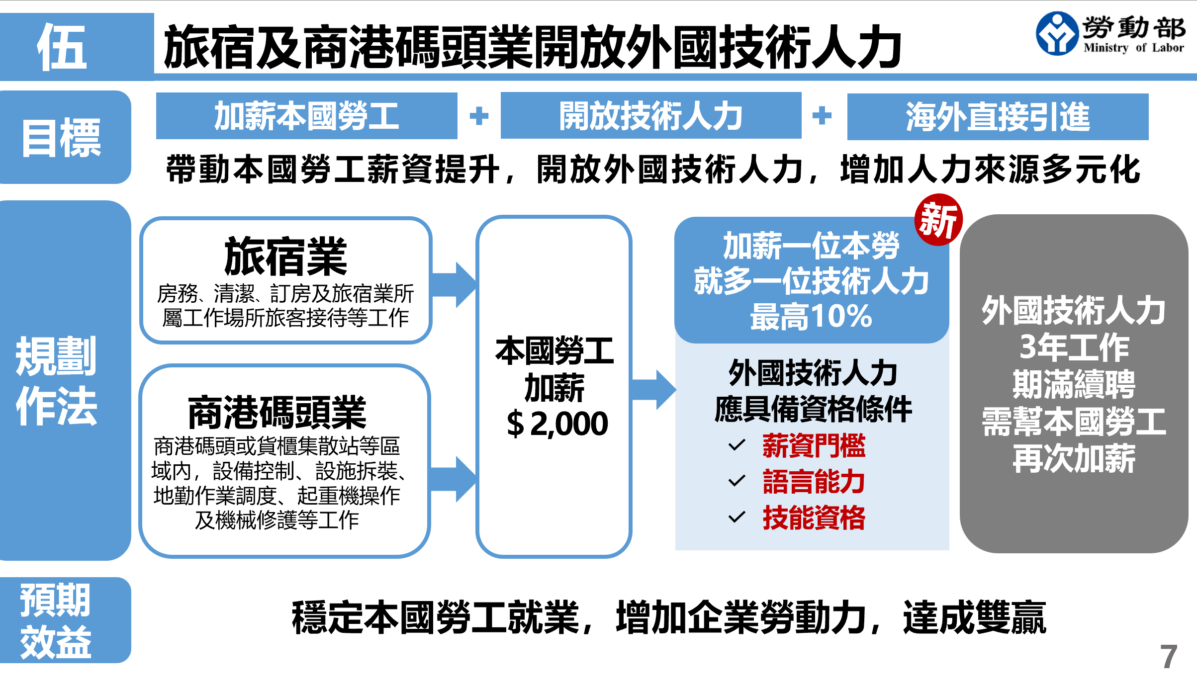 跨國勞動力精進方案中,開放「旅宿服務工作」、「商港碼頭貨物裝卸集散工作」得聘僱外國技術人力且直接從海外引進,雇主美加薪一位本國勞工就多一位外國技術人力名額。勞動部提供