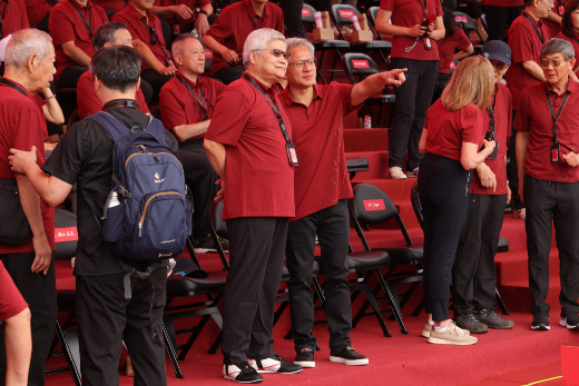 2025年台積電運動會,董事長魏哲家與黃仁勳對媒體揮手打招乎。李政龍攝