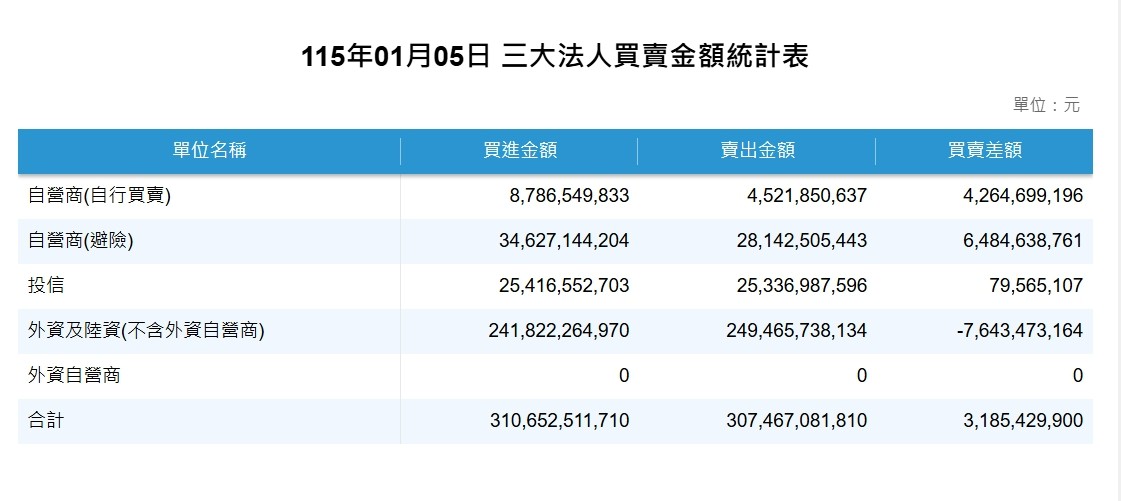 根據盤後統計,三大法人今天合計買超31.85億元,其中外資賣超76.43億元,投信買超7956萬元,自營商(自行買賣)買超42.64億元,自營商(避險)買超64.84億元。
