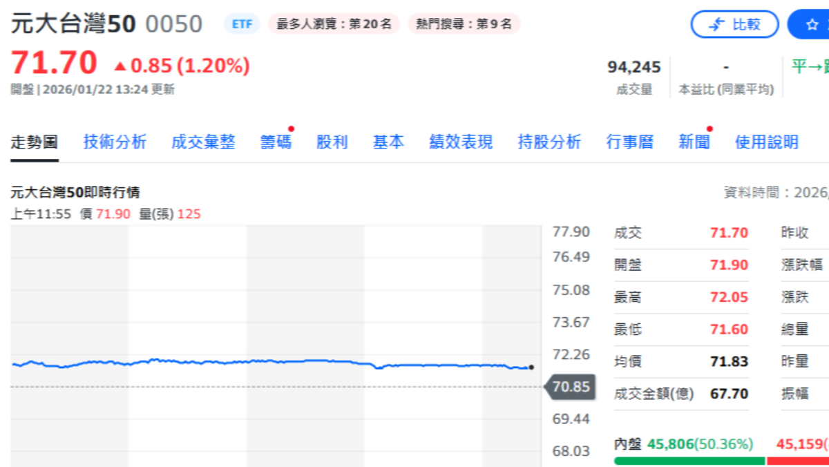 0050自分割後,受益人數狂增,最新1月6日受益人數已來到211萬3798 人,資產規模截至昨日已來到1兆1045億元。0050今天除息1元,持有一張能領息1000元,以最新淨值71.74元估算,因為每半年配息一次,年化配息率為2.78%。