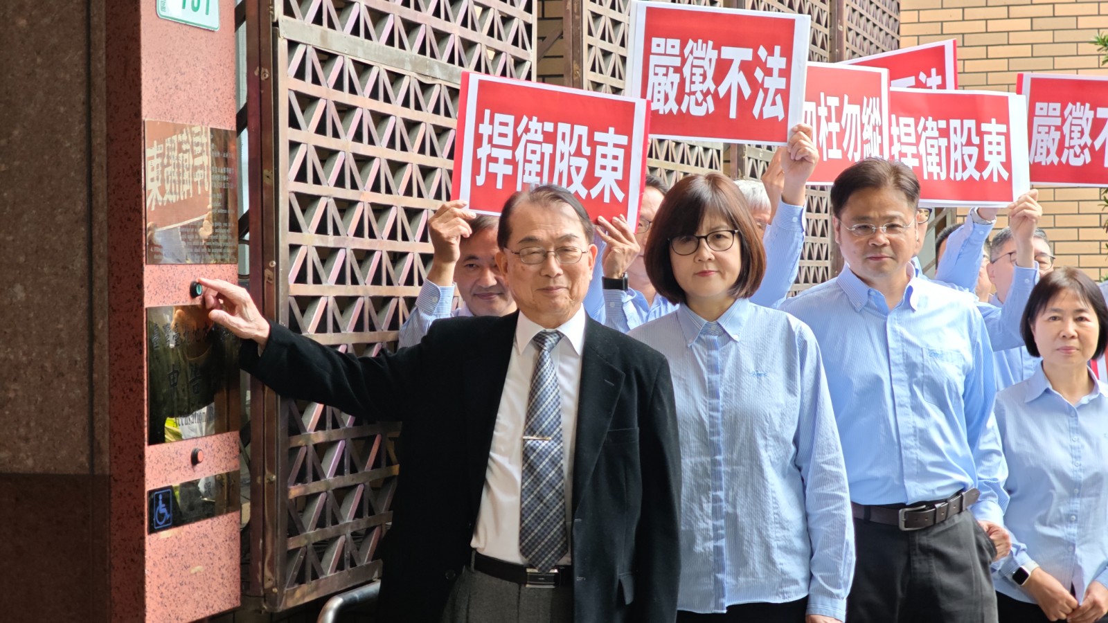 中工董事長周志明(按鈴者)及總經理蘇麗梅(圖右)為捍衛經營權,曾前往台北地檢署告發委託書通路商及律師。資料照。呂志明攝