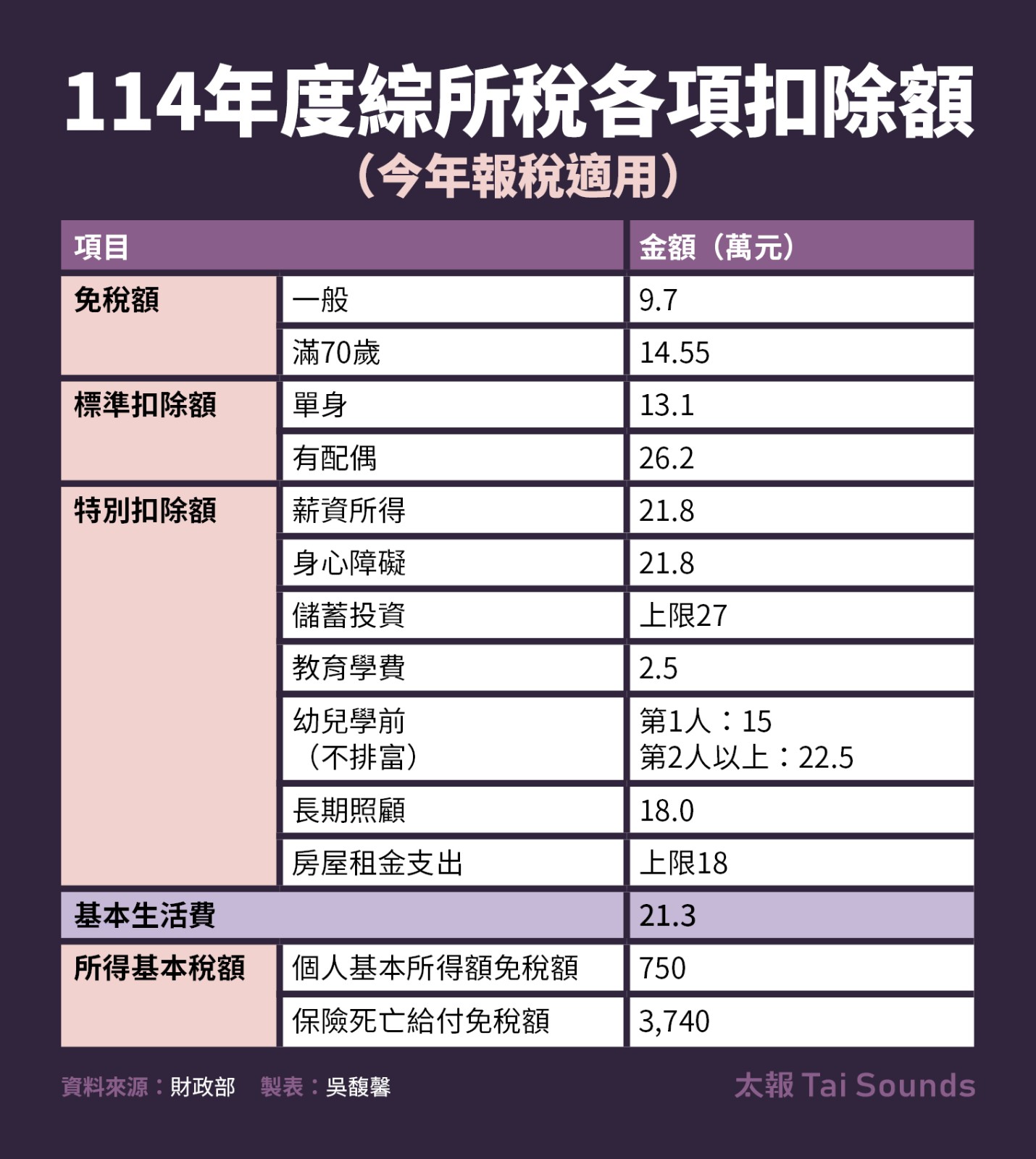 114年度綜所稅各項扣除額(今年報稅適用)。太報製表