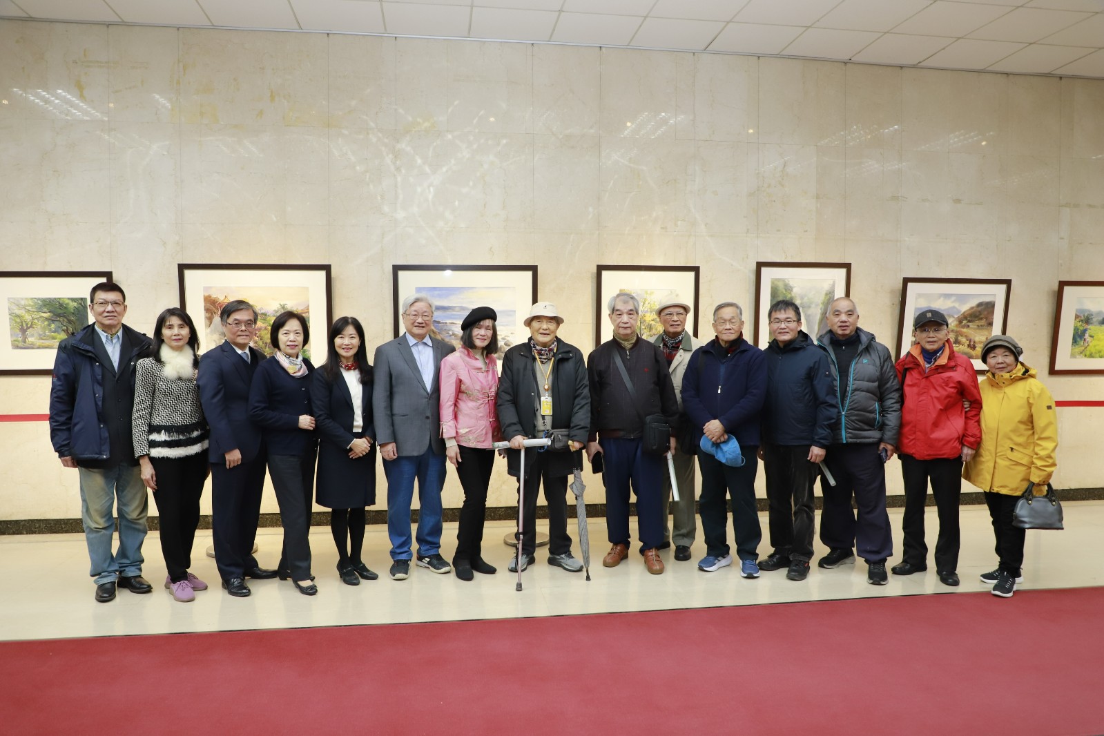 客家籍畫家劉雲(左七)及友人一同與土銀副總蔡慈瑛(左五)、土銀董事會主秘鄭瑟琴(左四)、土銀秘書處處長程權勝(左三)合影。土銀提供